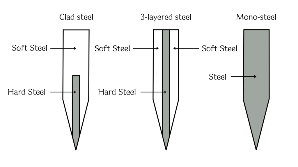 This structure consists of a hard steel core sandwiched between layers of soft steel from both sides. Since the sides are made of soft steel, it has the advantage of making the process of grinding down the thickness of the sides smoother compared to mono-steel blades.